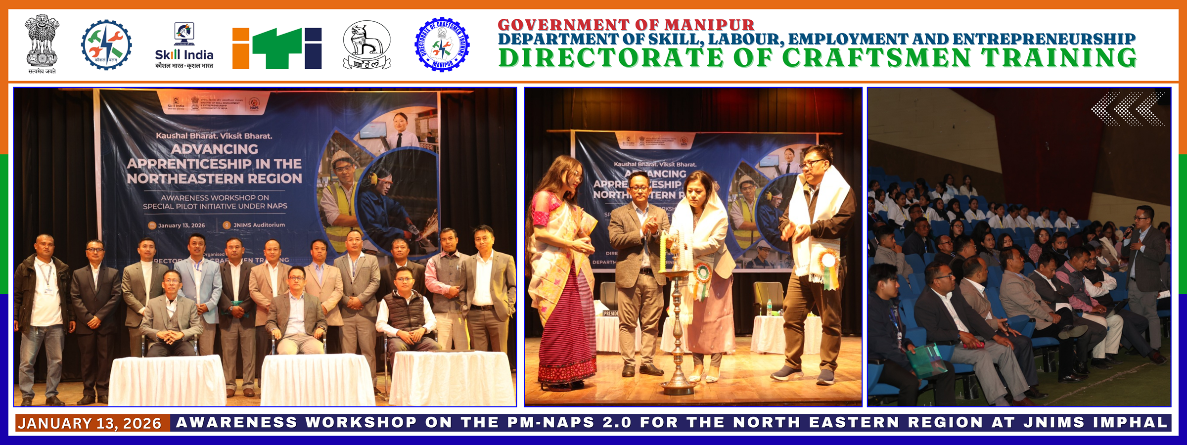 Placement Drive on 16th January 2026 (Friday) at Govt. ITI Imphal, Takyel, organized by MGT Motors (P) Ltd., Tata Motors.Felicitation-cum-Interaction Programme of Selected Candidates for Japan, Date: 8th Jan, 2026; Time: 11: 00 A.M onward;Venue: Survey Hall of Government ITI Imphal, Takyel, Manipur.Placement drive on 6th January, 2026 at Govt. ITI, Imphal, Takyel by MGT MOTORS LTD.Placement drive on 7th January, 2026 at Govt. ITI, Imphal, Takyel by JCNT ELEVATORInformed to all the Principals/Supdt. (Tech.) of Govt lTls,Manipur, that the FinancJ DSpartment has commenced the exercise for preparation of RevisedEstimates for the year 2025-26 and the Budget Estimates for the year 2026-27Order: ExaminerNotice : The Aptitude Test for the session 2025-26/27 shall be completed by 31st October, 2025.Details of admission feesCircular: It is hereby informed to all the concerned Principals and Superintendent (Tech.) of Govt. ITIs, Manipur to organise Swachhata Hi Seva (SHS) campaign, 2025 under the banner” Clean Green Festivities under Swachhata Hi Seva (SHS), 2025”Circular: The CMIS Employee Corner (https://employee.man.nic.in) has been launched to provide staff access to service profile and payroll details. Employees with EIN may register online or via the mobile app available on Play Store.Hostel ResultsNotice: Spot AdmissionNotice: Office time Scheduled from 09: 00 AM to 05:00 PM.Notice for academic session 2025Second round selection list for Admission 2025Online Admission LinkDetails Regarding Admission Fees & OthersCircular: Participation in India Skills Competition 2025 – Awareness and Registration DriveResult/Admission Notification for Academic Session 2025-2026/27Office Memorandum: I am directed to inform all the concern HoO to comply with this OM.CircularFinal Seniority list of Grade-IV in respect of this Directorate.Notice: Nominations for the National Award for Excellence in Vocational Training & Entrepreneurship Development (2024) have started from 3rd July 2025.Notice: It is hereby informed to all the concerned Principals of Govt. ITIs Manipur that there will be a meeting in Hybrid Mode(including VC), on Tuesday, the 8th July, 2025 at 11:00 am in the Conference Room: 1. Land Records and Related Documents, 2. MiscA tentative Seniority list in respect of Grade-IV post under this Directorate of Craftsmen Training, Manipur is hereby published as Annexure-A.Notice: It is hereby informed to all Crafts Instructor of Electronics & ICTSM at all Govt. ITIs that CFDAC, Hyderbad is Organizing (FDPS).A Final updated Seniority list enclosed as Annexure-A in respect of L.D.C Post, 2025PROSPECTUS FOR ADMISSION TO GOVT.INDUSTRIAL TRAINING INSTITUTES 2025-26/27ITI Admission Notice with Brochure for the Academic Session 2025-26/27A tentative Seniority list in respect of L.D.C post under this Directorate of Craftsmen Training, Manipur is hereby published as Annexure-A.It is hereby circulated to all the concerned Principals and Superintendent (Tech.) of Govt. ITIs, Manipur, Aadhaar Integration in Central Management Information System (CMIS), in the given format enclosed as Annexure, on or before 5th June, 2025.It is hereby circulated to all Principals of Govt. ITIs Manipur that the Manipur Civil Services Tennis Association (MCSTA) is organizing the Civil Services Tennis Tournament, 2025 at the Officers’ Club, Lamphelpat from 9th May to 11th May, 2025.It is hereby circulated to all Principals of Govt. ITIs Manipur that there will be meeting on 29th April, 2025 at 11:30 am in Conference Room of this DirectorateNotification for Engagement of Graduate/Diploma Apprentices/Trade(under Apprentices Act, 1961) for the year 2025-26 in Airports Authorities of India, North Eastern RegionThe Directorate of Craftsmen Training, Manipur expresses gratitude to NSDC for their support in facilitating online job registration for students, significantly boosting their career prospects. It is inform to all staff that they should attend office in time during this March Financial year 2024-2025Responsibilities and Consequences of Non-Compliance with the Transgender Persons (Protection of Rights) Act, 2019Formation of the Committee for the Welfare and Empowerment of Transgender Persons under the Protection of Rights Act, 2019The following staff members have been appointed as Nodal Officers to oversee the implementation of the Prime Minister’s Internship Scheme within the Directorate of Craftsmen Training, Manipur.It is hereby informed to all Principals of Government ITIs in Manipur that a meeting chaired by Secretary, SLEE, Govt. of Manipur will be held on 19th February, 2025 at 12:00 Noon in the Office Chamber of Secretary (SLEE), Govt. of Manipur.All Principals of Government ITIs in Manipur are required to prepare a PowerPoint presentation covering key details and submit both soft and hard copies by this week for a meeting with the Secretary (SLEE), Govt. of Manipur, scheduled for next week.Schedule for Manipur Legislative Twelfth Assembly, 7th Session commencing from 10th February, 2025.All concerned Principals, Superintendents (Tech.), Supervisors, Crafts Instructors (Engineering & Non-Engineering), and Storekeepers are requested to submit their qualification details (Educational, NCIC, etc.) to this Directorate by 17th February 2025 for record updation and official purposes.Internal Complain Committee in Connection of Sexual Harassment of Women at Workplace.Annoucement : Exam result for SCVT 2025The Directorate of Craftsmen Training, Manipur website is now fully developed and accessible to everyone from anywhere. Explore our resources and stay connected with us!A Campus Placement Drive by GE Healthcare will be held on 10th Jan,2024 at Govt. ITI, Takyel, (Imphal)Online Registration