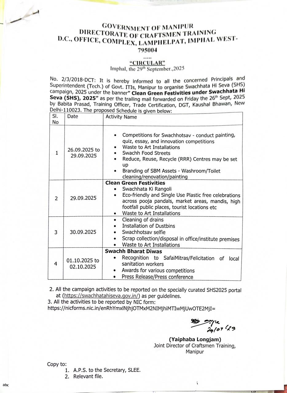 Circular: It is hereby informed to all the concerned Principals and Superintendent (Tech.) of Govt. ITIs, Manipur to organise Swachhata Hi Seva (SHS) campaign, 2025 under the banner” Clean Green Festivities under Swachhata Hi Seva (SHS), 2025” CIRCULAR