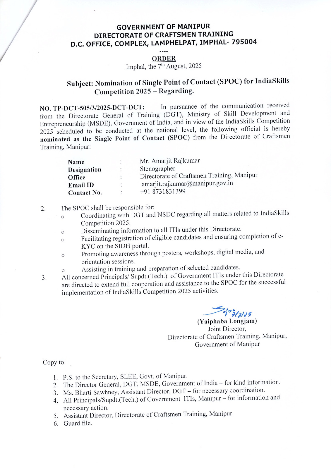 | 1/1/2024-DCT(PMIS) | The following staff members have been appointed as Nodal Officers to oversee the implementation of the Prime Minister’s Internship Scheme within the Directorate of Craftsmen Training, Manipur. | 25/02/2025 | Doc |