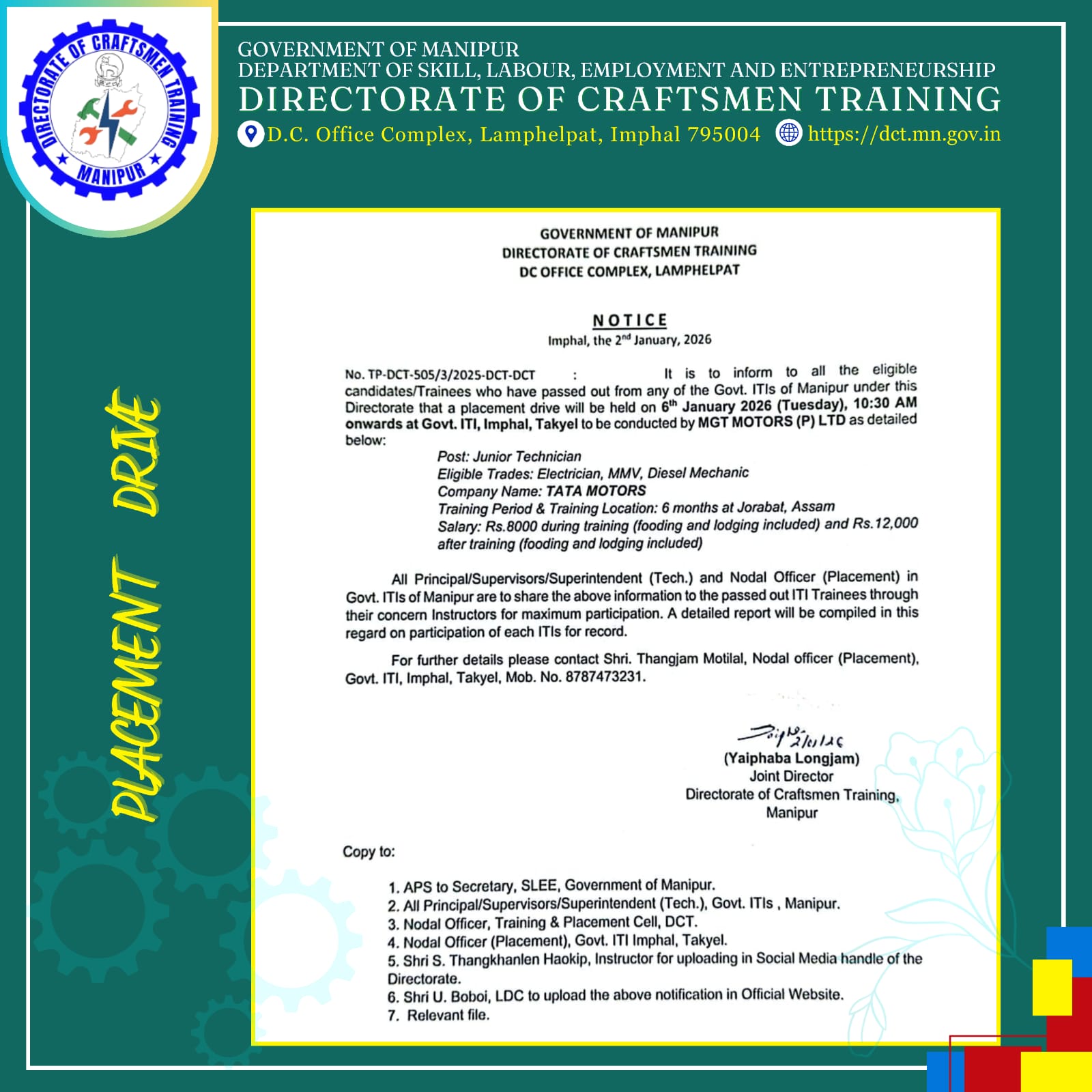 A Campus Placement drive by GE Healthcare will be held on 10th Jan,2024 at Govt. ITI, Takyel, (Imphal)https://dct.mn.gov.in/wp-content/uploads/2025/01/WhatsApp-Image-2025-01-09-at-4.30.22-PM1.jpeg Placement drive on 6th January, 2026 at Govt. ITI, Imphal, Takyel by MGT MOTORS LTD. Placement drive on 7th January, 2026 at Govt. ITI, Imphal, Takyel by JCNT ELEVATOR